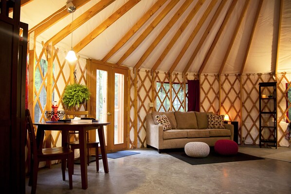 En yurt er en teltlignende sirkulær stoffstruktur med en trerammerramme som oppsto blant de nomadiske stammene i Asia. Disse permanente, fargerike strukturene har tykke yttervegger på lerret som inkluderer refleksisolering og en høyeffektiv varmepumpe / vekselstrømsenhet, slik at du kan være komfortabel i løpet av enhver sesong. Yurts er raskt i ferd med å bli en ny ferieopplevelse som ferierende gleder seg over hele USA fra utsikt over klippen i California til skihytter i Colorado. Dette er et minneverdig sted å bo mens du nyter skjønnheten i Acadia!