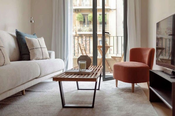Your home in Barcelona awaits. This thoughtfully designed 55 m² apartment creates an instant sense of belonging with its warm, inviting atmosphere. Featuring a master bedroom with a queen-size bed, a second smaller bedroom with a double bed, two full bathrooms, and an open-concept living space that flows onto a furnished balcony, the perfect spot for morning coffee while watching Barcelona come alive.