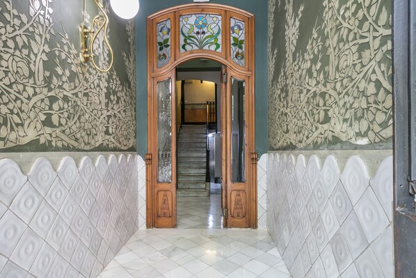Hovedegenskapene sont ses, Lampeskjermer 3 mètres de haut, décorées Art nouveau dans un stil, Les Portes fenetres et les décorées, planchers des et du tout dans l'appartement parkett. Et une hell galerie foredle det bor après une journée de Barcelone et besøk.