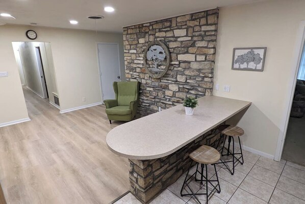 The breakfast area is just off the kitchen. It offers a long countertop bar with seating for 4.