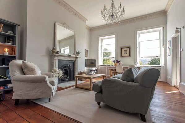 Up a flights of stairs to the front door of the flat you enter into a spacious hallway. The sitting room is beautifully decorated with very plenty of comfortable seating and a smart TV. This room has great views over Bath's cricket ground. A dining table is in the sitting room and off this area is a modern, well equipped kitchen. The bedroom has a king size bed (zip and link if you require 2 singles). The bathroom has a bath and separate shower cubicle.