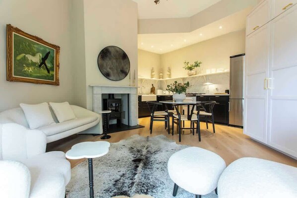 The stylish living area has comfortable seating for four people, a wood burning stove for cosy winter nights and a smart TV.