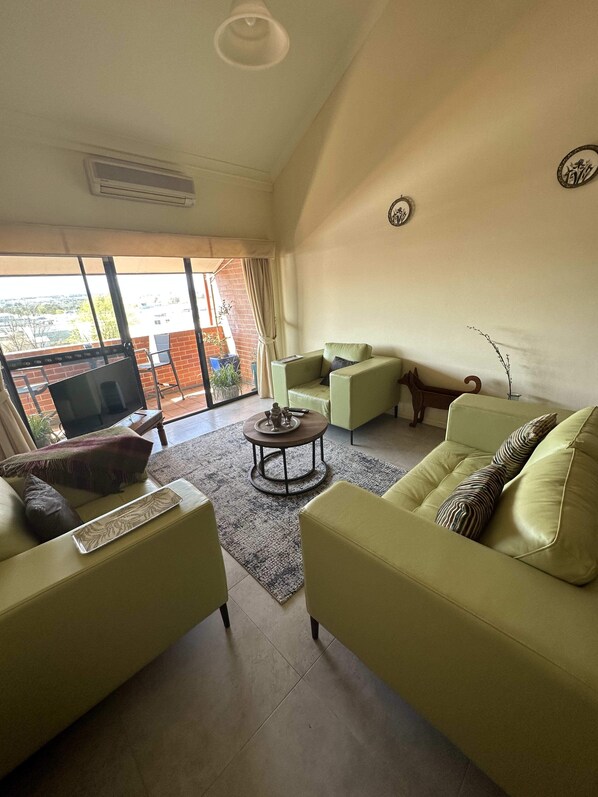 Living area: Comfortable lounge, TV with glass sliding doors that open onto the patio