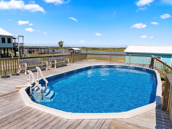 Outside, the magic continues. Enjoy your days casting a line from the private dock, with Caney Creek known for its great fishing. Cool off in the sparkling swimming pool, or simply lounge on the deck and soak in the tranquility. As the day winds down, take in the breathtaking sunsets that paint the sky with vibrant colors, creating a stunning backdrop for your evenings.