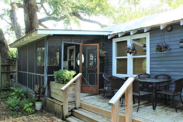 Bungalowen har alt, en unik gammel hjem med en moderne bluss i et boligområde bare et steinkast fra stranden. Du vil nyte vakre tregulv, trådløst internett, kabel-TV, 32 "flatskjerm-TV, vaskemaskin og tørketrommel, verandaen, og en anlagt bakgård med privat dekk i en unik setting med murstein veier, tropiske planter og en kullgrill.