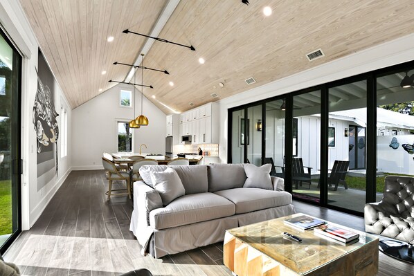 Open concept living with large windows and glass doors. High vaulted ceilings! Equipped with 2 king bed bedrooms and 2 full bathrooms, living room, well-appointed gourmet kitchen with an extra-large quartz island. This newly built home provides all BRAND-NEW luxury furnishings.