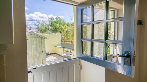 Outdoors - Sunny and sheltered south-facing terraces. Bistro set for 2, outside dining set for 4, parasol, Charcoal BBQ (please bring charcoal).