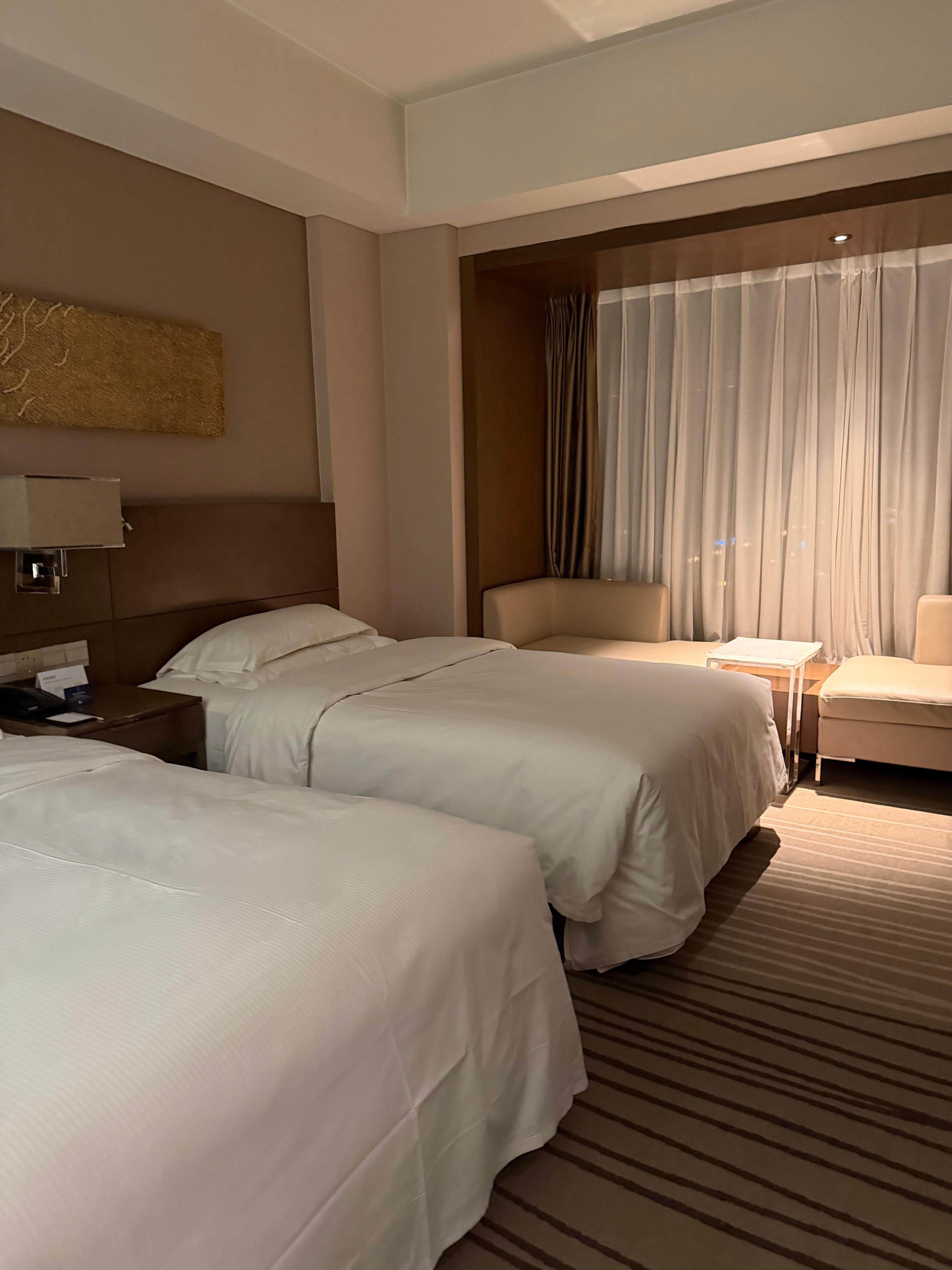 1.Room for 4 Travelers does not mean you get enough beds. Booked an Executve suite for our family of 4 and was told by the manager that we needed to pay extra for cots for our kids (11 and 13 yrs old ) as the room had only one bed. Pics on Expedia and Doubletree website show multiple beds in the room. Took a day and a talk with the GM to get two cots delivered making the room feel really cramped.