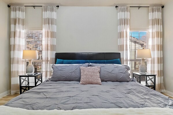 The primary bedroom has a plush king size bed, designated work station, smart TV for streaming, LARGE walk in closet and en-suite bathroom. The bathroom features soaking tub, walk-in marble shower and dual sinks. You'll find the high chair and pack-n-play in the primary closet.