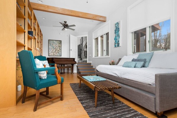 -Second Level Common Space "Reading Nook" and desk+chair for slipping away for some work. Large windows invite the outdoors in for a peaceful retreat.