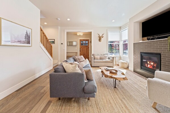 Step inside to a beautifully designed space that merges mountain charm with modern flair. The open-concept living area features sleek finishes, a gas fireplace, and ample natural light. The fully equipped kitchen is a chef's dream, boasting stainless steel appliances, Caesarstone countertops, and thoughtful touches like a Vitamix Blender.