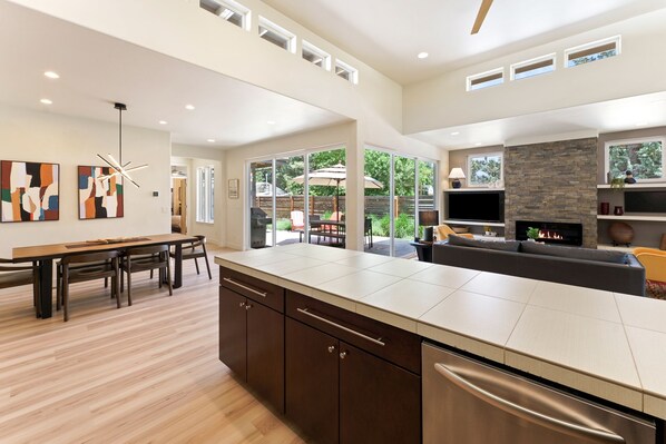 Step inside to find a seamless open layout filled with natural light, high ceilings modern furnishings, and thoughtfully curated textures. The kitchen is sleek yet warm, perfect for slow mornings or lively gatherings. A gas fireplace anchors the living space, offering a cozy spot to unwind after a day on the trails or slopes.