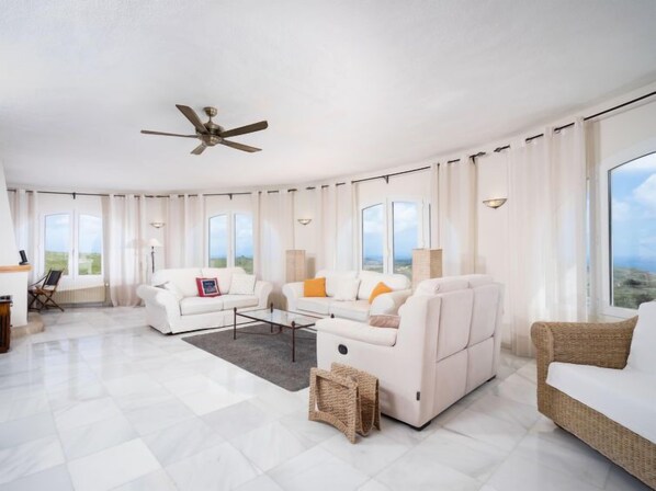 "Cielo Azul", 5 rom hus 250 m2 på 2 etasjer. Romlig: stue/spisestue med, satelit-TV og air-conditioning. Utgang til terrassen. 1 rom med 2 senger (90 cm lengde 200 cm), air-conditioning. 1 rom med, 1 dobbeltseng (160 cm, lengde 200 cm), air-conditioning. Stort, åpent kjøkken (stekeovn, oppvaskmaskin, 3 induksjonskomfyr, brødrister, vannkoker, mikrobølgeovn, frys, elektrisk kaffemaskin, Internet(Krups Nespresso)). Dusj/WC. Oppvarming, gassoppvarming. I underetasje: 1 dobblet rom med, 1 dobbeltseng (2 x 90 cm, lengde 200 cm), air-conditioning. Utgang til terrassen, til badebassenget. 1 rom med, 1 dobbeltseng (160 cm, lengde 200 cm), bad/dusj/WC og air-conditioning. Utgang til terrassen, til badebassenget. Dusj/WC. Stor terrasse. Terrassemøbler, grill, liggestoler. Hærlig panoramautsikt av havet og landskapet. Fasiliteter: vaskemaskin, tørketrommel, strykejern, hårføner. Internett (trådløs LAN [WLAN], gratis). Parkeringsplass. Vennligst merk: røykfri bolig. Max 1 kjæledyr / hund tillatt. R-0000199