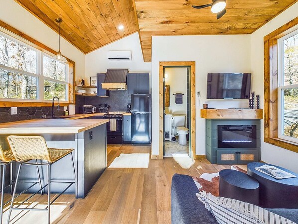 The living room provides you with a comfortable pullout sofa that also provides sleeping accommodations for two guests. The TV has a firestick and highspeed WIFI, ready to stream your favorite shows. Cozy up with an electric fireplace that provides a perfect ambiance to your movie night.