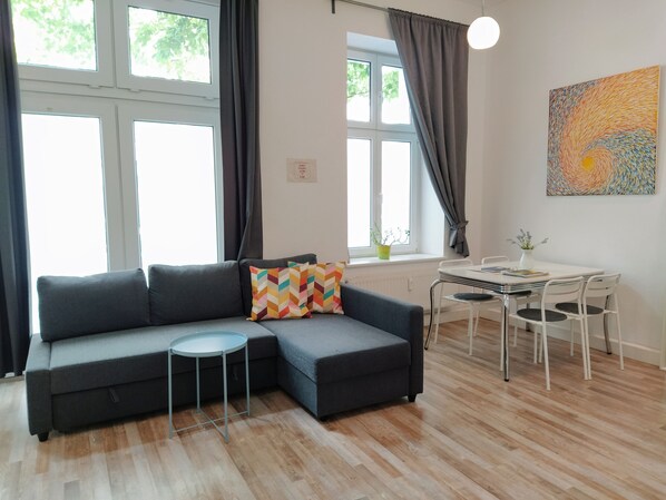Lovely, newly furnished studio. The main living area has a comfortable queen size bed (160x200), a couch that can be converted into a double bed (140x200), and a wardrobe. All our duvets are single duvets.