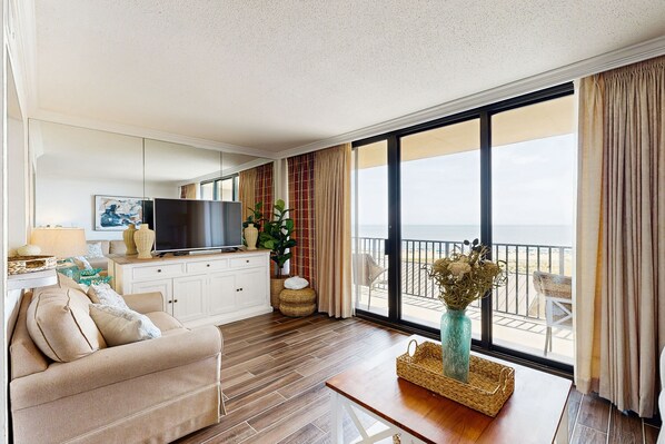 Start your mornings off right with a cup of coffee out on the private oceanfront balcony. Inside, the main living area boasts comfortable furniture strategically located near a large TV. The kitchen comes equipped with everything you need to prepare savory meals and snacks. The bedroom provides ample sprawling space and loads of natural lighting, ensuring that you're always comfortable and content.