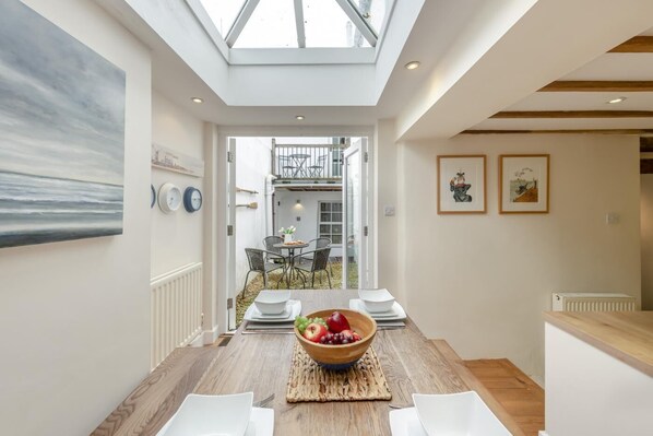 At the heart of this holiday home is the enchanting living room with its fantastic feature fireplace of exposed stone, complete with a wood burner-effect gas fire for the colder months of the year. Two sumptuous sofas sit around a TV for film nights, whilst the generously sized coffee table is ideal for board game competitions. Next door, the country-style kitchen is full of light thanks to the patio doors and overhead window creating a wonderful spot to cook and dine with your loved ones surrounded by calming neutral tones. Upstairs the master bedroom is furnished with a king-size bed with beautiful beams and tasteful decor, as well as an en-suite shower room for added privacy. From here you can also access the balcony for a morning coffee with a view. The two further bedrooms share use of the family shower room, comprising a chic double with in-built storage and a neutral twin. The garden area is a courtyard style with a table and chairs to be enjoyed when the sun is shining.