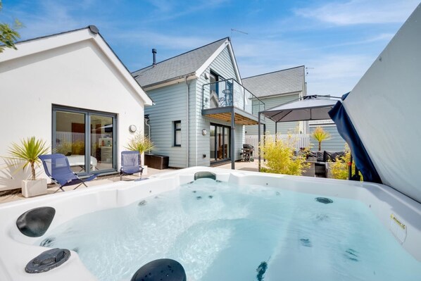 - Patio with a hot tub for 5, gas BBQ, garden sofa and dining table under a shade, outdoor shower, and a balcony with a bistro table and chairs