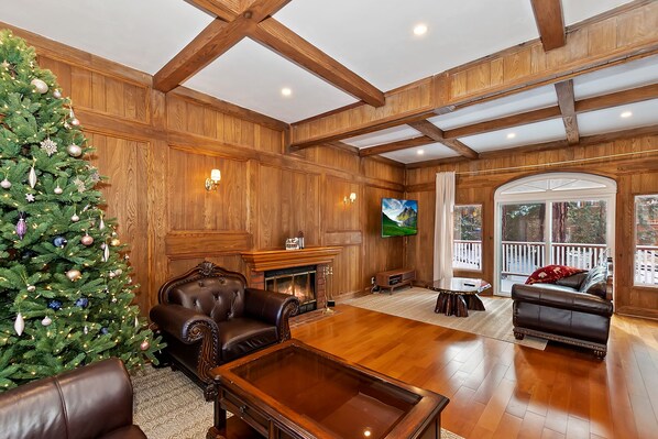 The main living area welcomes you with a comfortable and inviting layout, perfect for relaxing after a day of adventure. Leather sofas, warm wood finishes, and a crackling fireplace create a cozy mountain atmosphere for family time and movie nights.