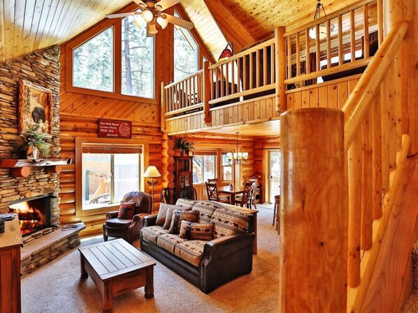 Når du kommer inn inngangsdøren, vil du bli møtt med store tømmervegger og høye hvelvede tretak som gir en åpen fjellfølelse. Det er en fantastisk peis for steingass for å kutte vinterens kulde og kjøligere kvelder. Lyset strømmer inn fra de store designervinduene mens fjelldekoren fyller hjemmet med varme og komfort.