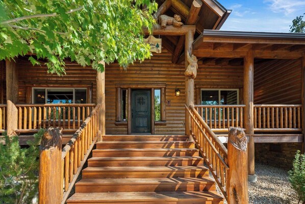 Spacious log-style home with soaring wood-beamed ceilings and modern comforts. Unwind in the private hot tub, or gather by the stone fireplace. The open living area flows into a chef’s kitchen, perfect for cooking and dining together. Located in a peaceful upscale neighborhood close to the Village, lake, and ski slopes, it’s an inviting retreat for every season.