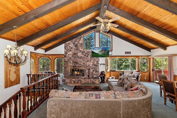 As you step through the front door, you'll find a convenient area to hang your jackets and store your outdoor gear, setting the stage for a seamless transition into cabin relaxation. Head upstairs to the main living area, where vaulted ceilings adorned with pine wood paneling, beam accents, and mountain-themed chandeliers create an inviting and modern rustic ambiance. The open floor plan features an oversized sectional couch and two plush lounge chairs, perfect for cozying up by the wood burning fireplace while you enjoy a movie night or on the smart flatscreen TV after a long day of outdoor adventures.