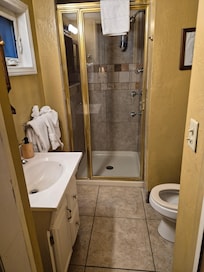 Småhus, 1 queensize-seng, peis