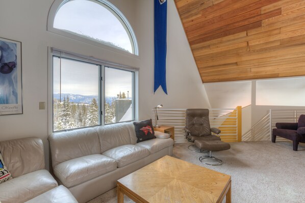 Four floors: bedrooms on levels one and two, kitchen and gathering space on level three and loft to watch TV on level four. Bathrooms on levels one and two near the bedrooms. Indoor hot tub available for sore muscles after skiing. Great deck to soak up the sun.