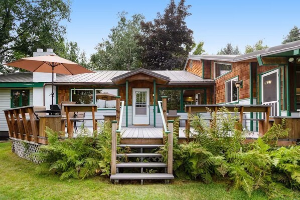 Enjoy long summer days on the spacious back deck—perfect for grilling and outdoor dining. Head down to the private dock for kayaking (three provided), swimming, or fishing for northern pike and rainbow trout. The large grassy lawn is ideal for yard games, with frisbees, football and croquet, and more available.
