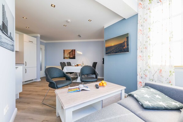 Denne to-roms leiligheten ligger i første etasje med en balkong på soverommet. En moderne boksfjærseng (2x 0,80 x 2,00) gir en drømmende søvn. Den nylig renoverte og moderne møblert stuen har en sovesofa, spisestue og integrert kjøkkenkrok (oppvaskmaskin, keramisk platetopp, stekeovn, etc.). På dagslysbadet finner du en ekte glassdusj, speilskap og toalett. Flatskjerm-TV i stue og soverom. Gratis wifi, parkering i hotellets egen underjordiske parkeringsplass gratis.