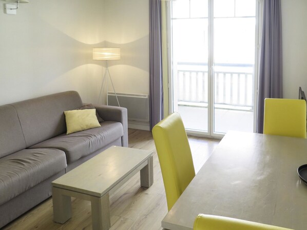 "Les Balcons de l’Océan", 1 rom leilighet 27 til 37 m2. Lys, koseligt møbler: stue/soverom med, 1 dobbel sovesoffa (160 cm), spisebord og TV. Sovealkove med 2 senger. Kjøkkenkrok (oppvaskmaskin, 2 keramiske kokeplater, kombinert mikrobølgeovn). Utgang til balkongen, til terrassen. Bad/WC. El-oppvarming. Balkong, eller terrasse. Fasiliteter: høy barnestol barneseng (ekstra). Vennligst merk: max kjæledyr/små hunder tillatt 2 kjæledyr/små hunder tillatt. Røykvarsler, brannslukkningsapparat. I stedet for et innelukket soverom befinner noen soveområder seg i et åpent område (galleri, alkove e.l.).
