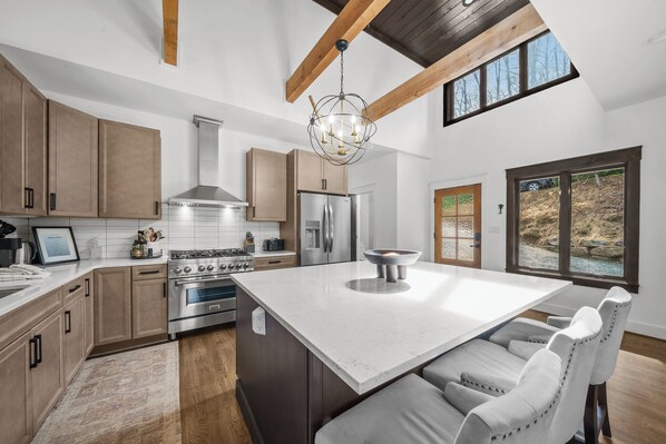 Inside, Whistle Hollow offers two comfortable levels designed for relaxation and connection. The main level welcomes you with vaulted exposed-beam ceilings, warm wood floors, and a cozy gas fireplace anchoring the living space. A plush sectional invites you to unwind after a day of exploring, while the open layout keeps everyone connected. The spacious kitchen features beautiful quartzite counters, a six-burner gas stove, island seating, and an adjacent dining area with wooded scenery through the window. A pass-through keeps the kitchen, dining, and living spaces flowing together seamlessly. Step outside to the covered main-level balcony to enjoy fresh mountain air in any season.