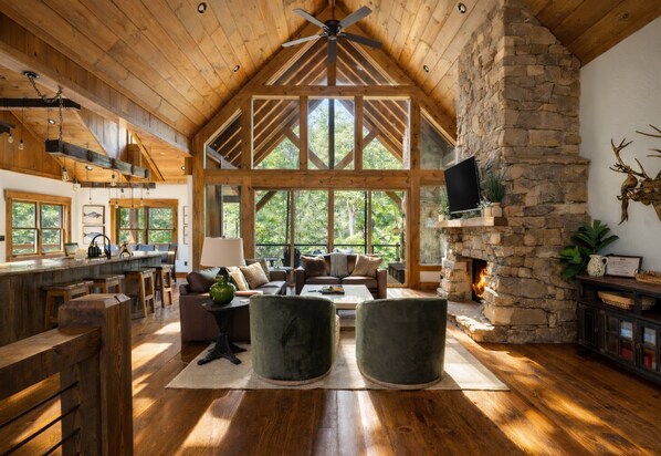 The heart of The Creek Haüs is its main living room, where soaring vaulted ceilings, a striking stone fireplace, and plush seating invite you to slow down and settle in. Large windows frame peaceful woodland views, filling the space with natural light and creating the perfect setting for quiet mornings, shared meals, and cozy evenings by the fire.