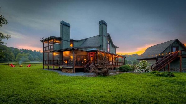 Step outside onto the wraparound main level screened-in porch and you'll find a double-sided wood-burning fireplace, outdoor dining table and plenty of comfortable seating. Bring your fishing pole down to the creek or enjoy a quick dip to cool off from the summer heat.