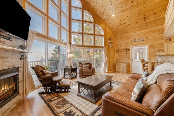 At home, start the day with coffee on your multi-level wraparound deck, watching the sun rise over the mountains. The view continues inside thanks to soaring cathedral ceilings and a full wall of windows. Wood-paneled walls, hardwood floors, and a gas fireplace enhance the cabin vibe. The full, well-equipped kitchen makes meal prep a breeze, and the whole group can eat together at the large dining room table. Entertainment options at home are abundant. Stream the latest release on either of two TVs; gather everyone for movie night with the pull-down screen and projector in the lower level; play some pool in the game room on the lower level; or take turns singing your favorite songs on the karaoke machine.