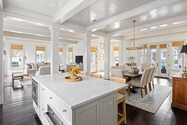 • Chef's kitchen with oversized island (seats three), luxury range, wine fridge, two undercounter beverage fridges, and a stylish butler's pantry