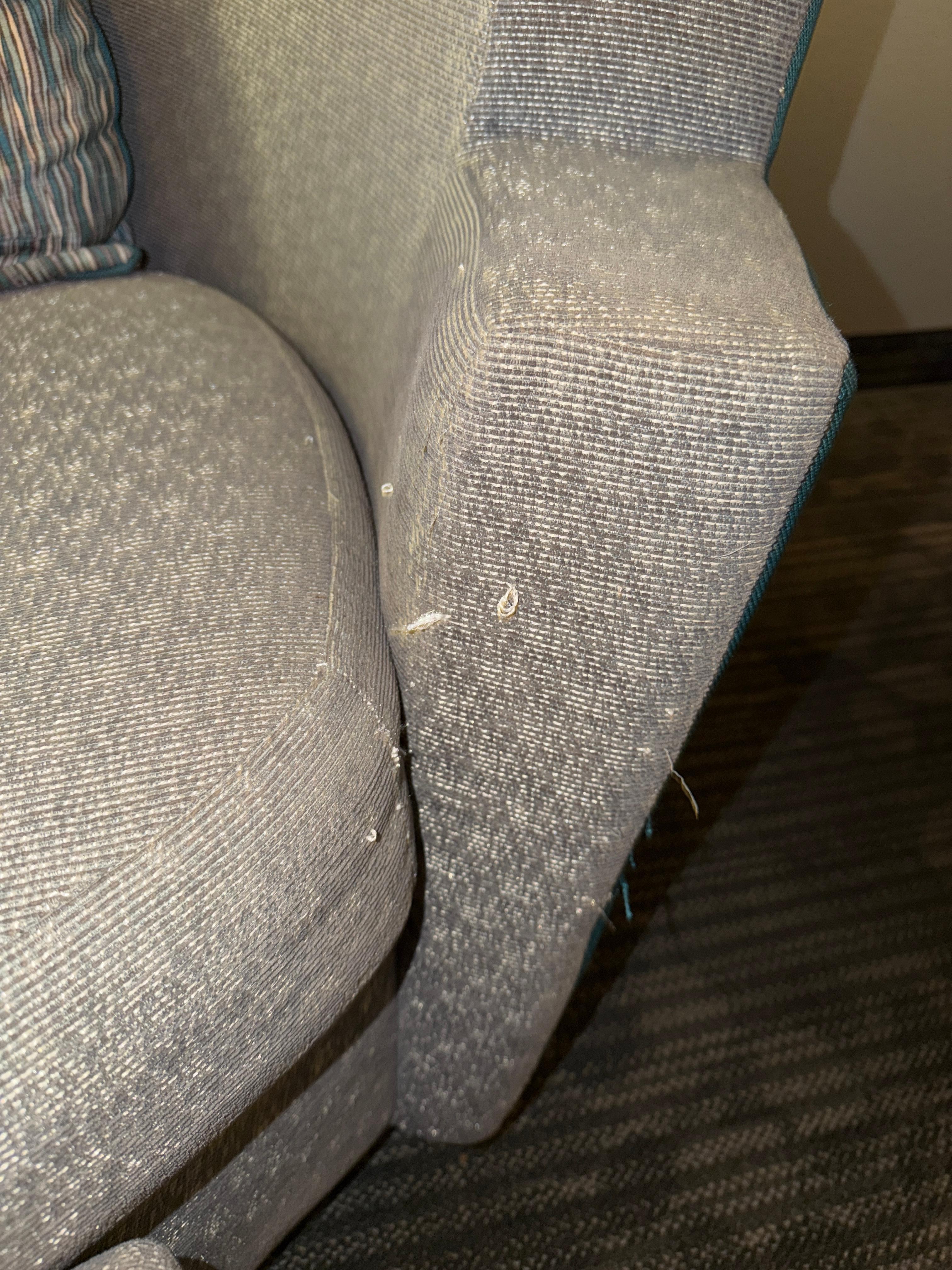The furniture in the room was tired, couch stained and fabric picked quite badly. Chair seat was stained.