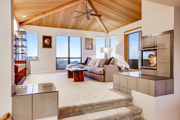 The interior comes recently updated with all new furnishings. This elegant escape features an expansive, two-tiered living space boasting views of Tomales Point, Seal Rock, and the Links at Bodega Harbour's 7th green. The sparkling kitchen is equipped with a full suite of appliances, ample counter space, and a door with access to the gas grill. This multi-level home also offers a firepit, free WiFi, and a jetted tub.