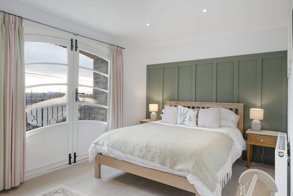 The beautiful bedrooms and ultra comfy beds beckon for a blissful night's sleep. For those who are less mobile or prefer some privacy, one bedroom is on the ground floor. A delightful room styled in restful tones, which has its own en suite shower-room. From this room you access the outside terrace, a private spot away from the main courtyard, perfect for al fresco dining, meanwhile the main bedroom upstairs has the luxury of a balcony which takes centre stage in the courtyard, the perfect spot to start the day with a morning cuppa surveying all that surrounds you.