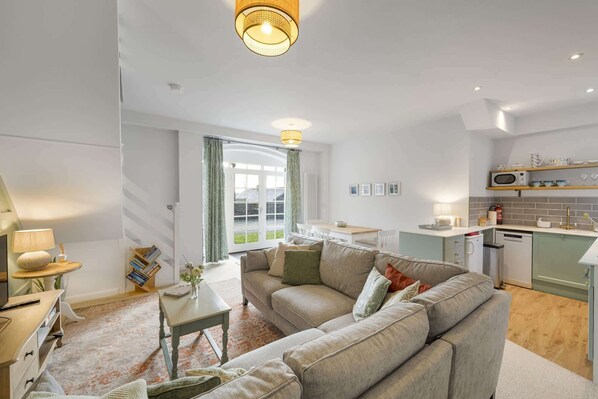 Behind the stone facade of this mid-terrace cottage is a beautifully presented home, surprisingly spacious with wonderful high ceilings; a nod to its origins as the original coach house to Tredethy House. The interiors are warm and welcoming, with the open plan living-room being the main event. The place for all to gather and create cherished memories together. The galley kitchen is perfect for cooking up some holiday feasts and with Cornwall firmly on the foodie map, you can get creative with some of the finest local ingredients. Cosy up in the living area for a film night on the smart TV, indulge in some holiday reading or simply enjoy some downtime - come on you deserve it, you are on holiday!