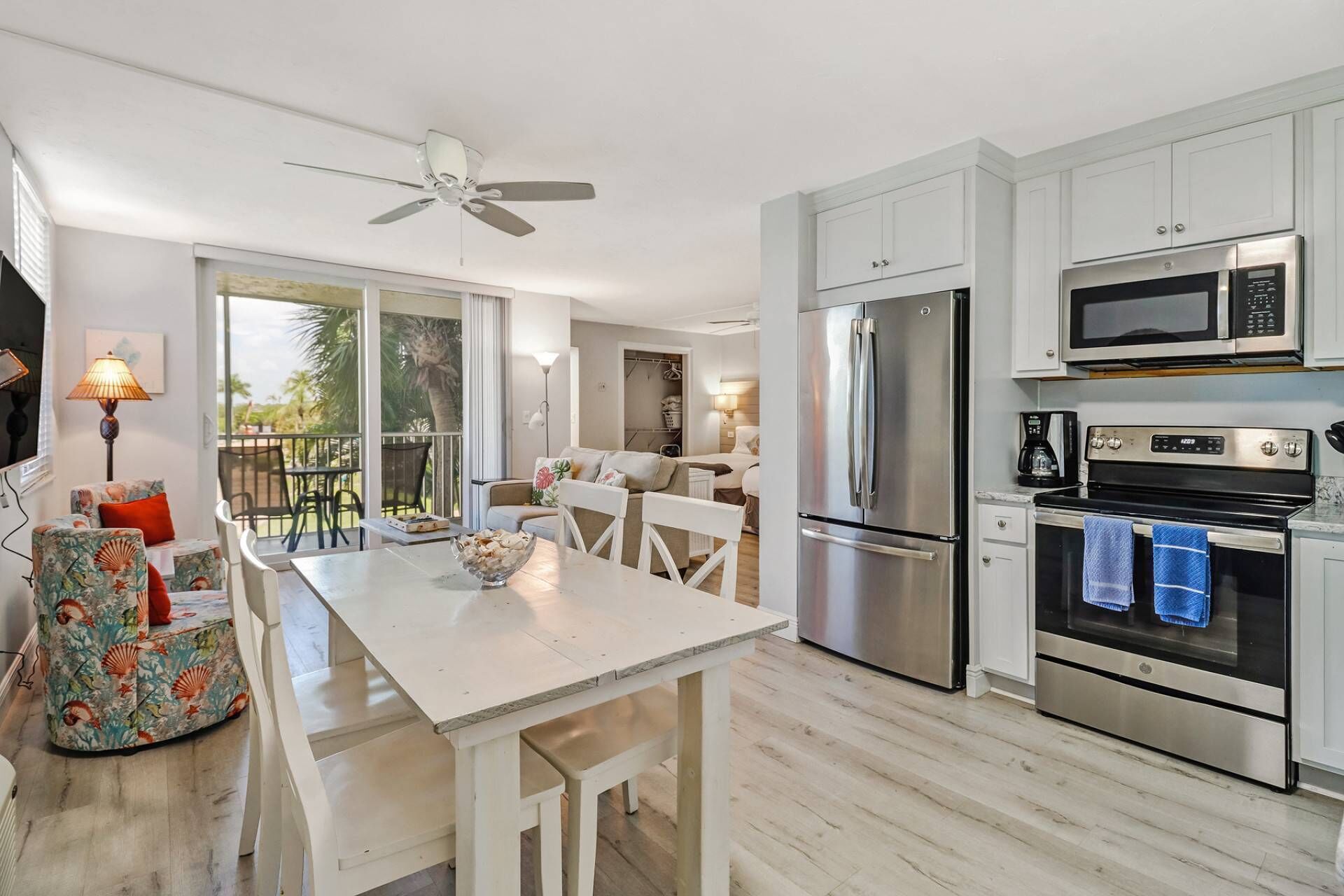 The living area includes ample seating, including a Lazy Boy powered recliner and queen sleeper sofa; community provided cable is on the TV. The full glass sliding doors in the living area opens to the screen enclosed 3rd floor balcony - which looks toward the Gulf just across the street.