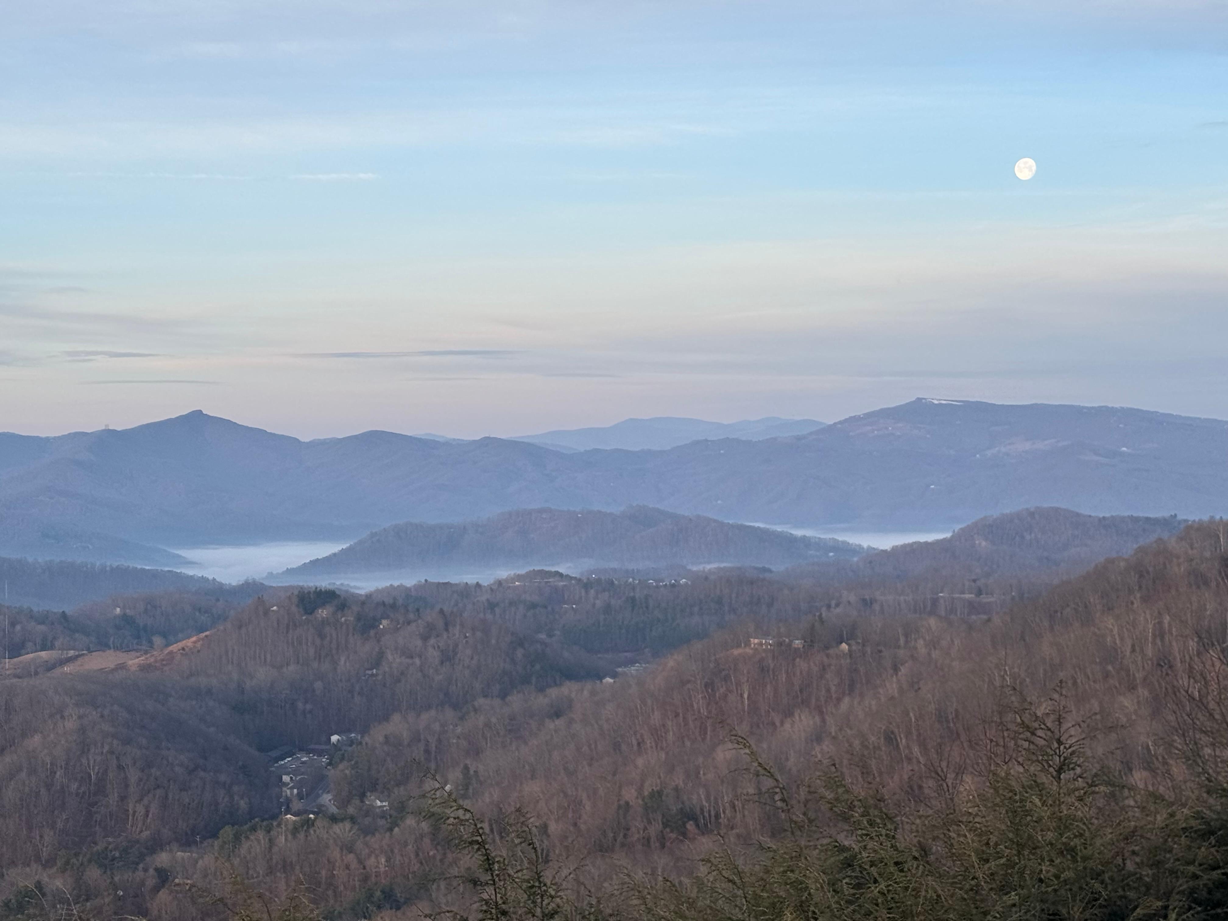 Outside: There is a gas fire pit on the deck with seating around overlooking Boone and incredible mountain views and stunning sunsets. There is parking for no more than 4 vehicles (graveled driveway).