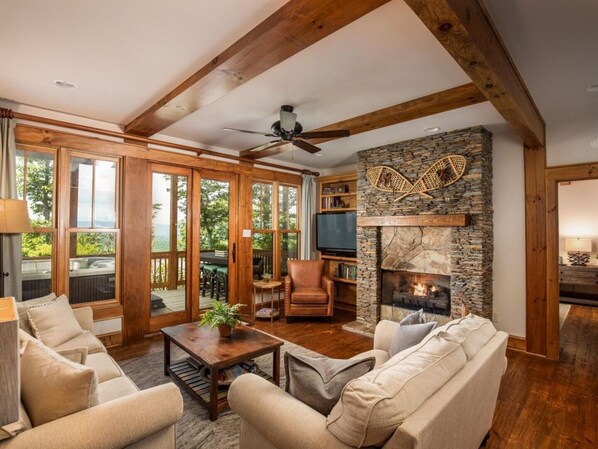 GREAT ROOM/KITCHEN/DINING - The main level is completely open with great room, kitchen/dining and doors opening to a large deck to enjoy expansive mountain views. The great room is perfect for relaxing with leather sofa, two story stone gas fireplace and large flat screen TV and Sonos system with built-in wall speakers.