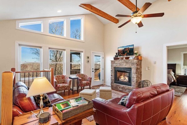 Hovednivået på App Ski Mtn Chalet tilbyr en åpen planløsning med hvelvede tak og synlige bjelker, et oppdatert kjøkken med granitt tellere og rustfrie hvitevarer, samt et hyggelig sekspersons spisebord. På baksiden av hovednivået, med utsikt mot fjellutsikten, er Stuen med skinnmøbler, gasspeis og HDTV. Off på baksiden av hovednivået er en fin dekk med utendørs spisebord og kullgrill, som ser ut på lang rekkevidde fjellutsikt. Det er også et halvt bad for å betjene disse delene av hovednivået.