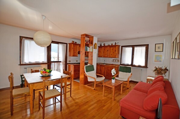 Welcome to this apartment in the heart of Borca di Cadore, this charming 2-bedroom apartment offers a comfortable and inviting retreat. Located in a quiet and private location, the accommodation offers everything you need for a relaxing holiday overlooking the Pelmo. Its central location allows you to reach the supermarket, pharmacy, bar, newsagent, buses to Cortina d'Ampezzo and Calalzo di Cadore, ski bus, children's playground. Ideal for families.The apartment has 2 bedrooms, with a total of 3 beds. The single room is equipped with an additional single bed that can be used if necessary. The apartment features a well-equipped kitchenette with a gas stove, fridge, washing machine, and all the necessary kitchenware. The living area is bright and airy, with access to a private balcony, perfect for enjoying the fresh mountain air. The apartment also boasts central heating, ensuring a cosy atmosphere throughout the year.The bathroom is equipped with a shower, bidet and a washing-machine.For your convenience, the apartment offers private parking in a garage located within the same building. Additionally, the apartment is equipped with room-darkening shades and blackout drapes, allowing you to enjoy a restful night's sleep.Whether you're seeking a peaceful retreat or a base for your outdoor adventures, this charming apartment in Borca di Cadore is the perfect choice. Immerse yourself in the natural beauty of the surrounding area and create lasting memories during your stay.