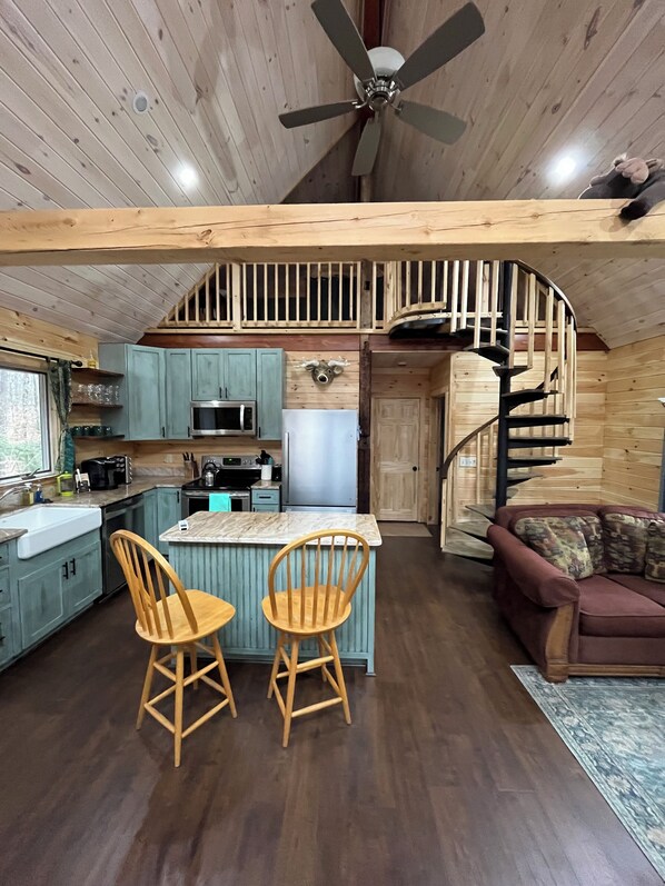 This newly finished cabin offers a comfortable and thoughtfully designed space that feels private and practical for everyday living. Inside, the main level features warm wood interiors that create a relaxed, cabin-style atmosphere. The living area flows easily into a fully equipped kitchen, where you'll find a full-size stove, refrigerator, dishwasher, and a full set of small appliances, including a coffee maker, toaster, blender, and mixer. Everything you need to cook and settle into a routine. The main-floor bedroom offers a convenient, private sleeping space. At the same time, the upstairs loft adds extra flexibility with a queen bed and a twin futon, making it ideal for hosting guests or even a quiet retreat.