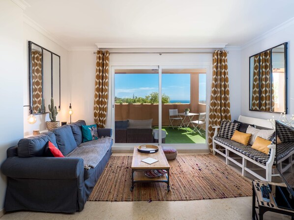 Leiligheten har 90m2 + 30m2 terrasser. 2 soverom med garderober og 2 fullt utstyrte bad / dusjrom. Renovert, to ting er åpenbare når du kommer inn i den: en fantastisk havutsikt over Middelhavet, Gibraltar, de marokkanske kysterne og golfbanen til Santa Maria Elviria på 150 meter, og virkelig komfort på grunn av den romslige plassen, men også den pene dekorasjonen.