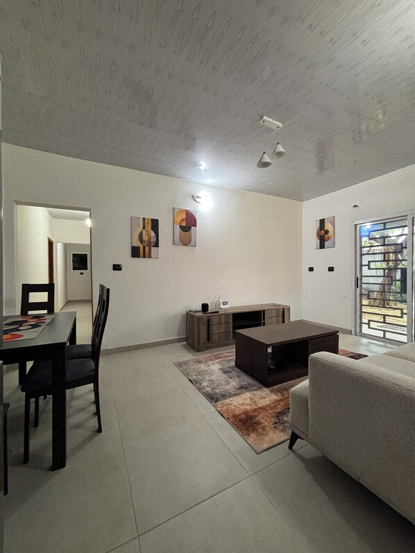 Alle gjesterommene på Modern 2-bedroom villa with garden and garage. kan friste med goder i form av klimaanlegg samt fasiliteter som wi-fi (inkludert) og spisebord.
