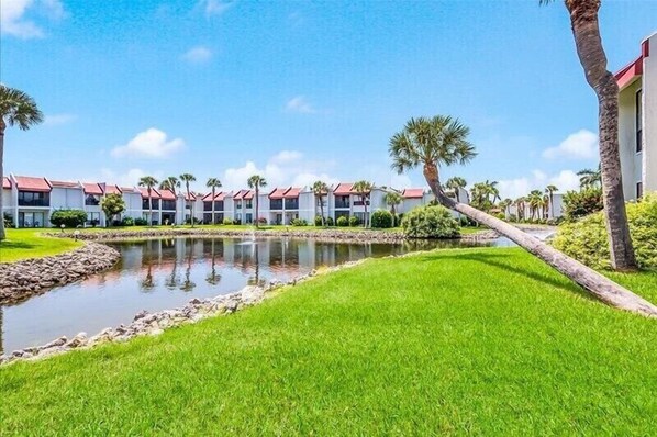 If you're looking for a ground floor condo, this is it! Super cute updated 2 bedroom/2 bath condo in Runaway Bay Condominiums in Bradenton Beach..*** Amenities in the complex are a tennis court, bocce ball, largest salt water heated pool on the island, exercise facility, canoe launch, sauna, and private fishing pier.*** Added bonuses include a nearby trolley stop, a view of the pond from your outdoor sitting area, wireless internet, extended cable, landline and private in-unit washer and dryer, full kitchen and large flat screen TV in living room. The master bedroom features a King bed with ensuite bath, TV and DVD player. The guest bedroom features a full-size bed and a twin bed, also with TV and DVD player. Sleeps up to 5.