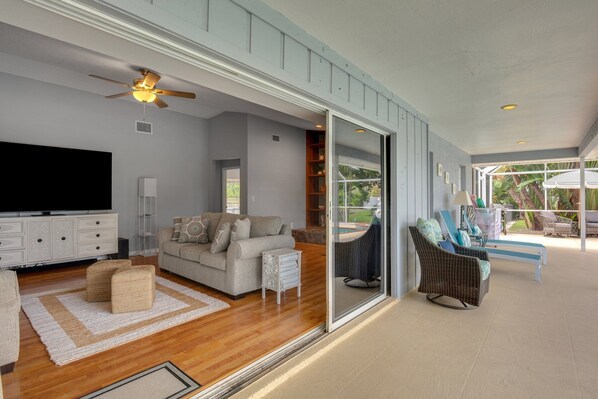 Property Details: Step into Sunshine Rays and be greeted by the bright and airy open floor plan, providing ample space for relaxation and enjoyment. The home features two living room areas, each with its own smart TV, one of which has a sleeper sofa and both providing direct access to the pool. Gather around the dining tables for family meals while taking in the serene views of the backyard pool and pond.